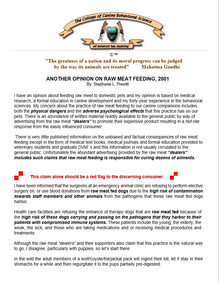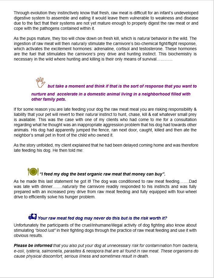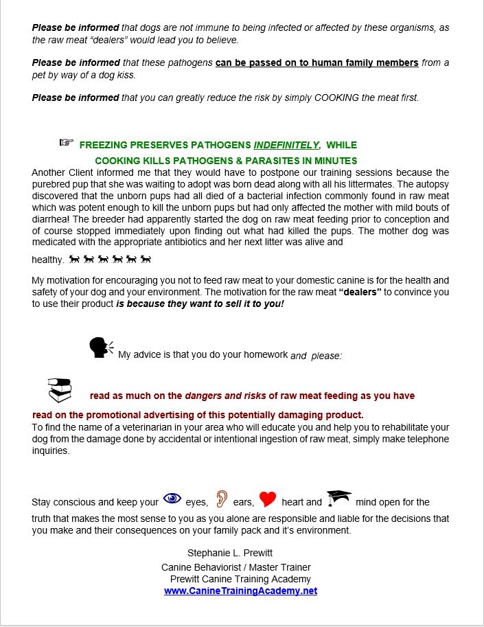 Here’s a great article by Stephanie L. Prewitt, Canine Behaviorist, Master Dog Trainer and Dog Psychology Expert, on why raw meat feeding is not good for dogs.
